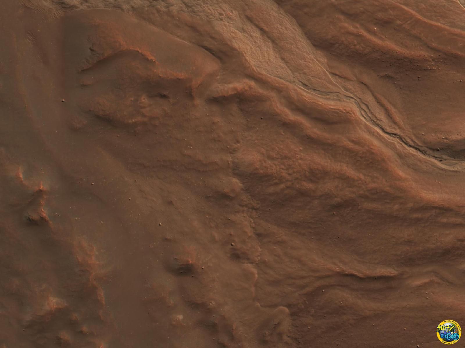 美国宇航局火星勘测轨道飞行器拍摄的火星一个陨石坑边缘的沟渠