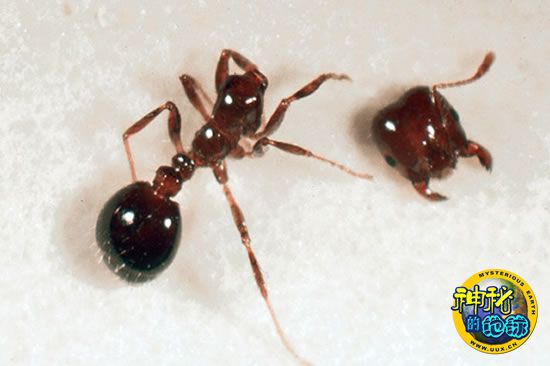 有人会说,图片展示的绝不是动物僵尸,但事实却不容我们争辩。在这幅未标明日期的图片中,我们看到的是一只已经身首异处的火蚁。在从已经空空如也的火蚁头内爬出前不久,一只phorid(一种南美苍蝇)幼虫已经从内部将火蚁变成一具僵尸。有时候,苍蝇幼虫甚至驱使火蚁从其“殖民地”前进到数十码远的地方,以避免遭到其它火蚁攻击。