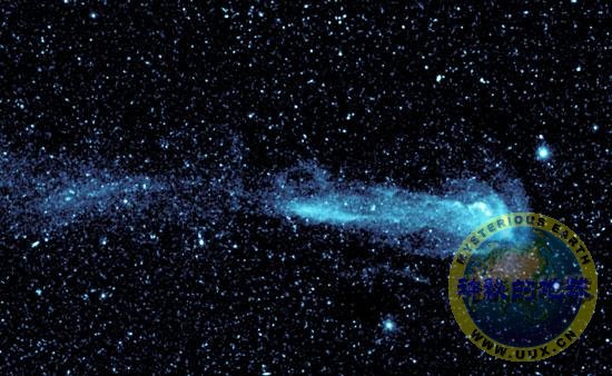 美国宇航局的图片显示,这条超级“尾巴”是一条炽热的淡蓝色物质流,构成物质包括氧、碳和氮。科学家说,随着时间的流逝,这些物质会逐渐脱离Mira——年代最久远的大约是在3万年前释放的——当时这颗恒星的死亡之旅已经上演,脱离的物质足以形成至少3000颗地球大小的行星。