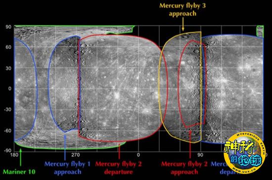 这是“信使”号第三次飞越后绘制的水星图像覆盖图。目前已经绘制出98%的水星表面地形图。在2011年3月“信使”号进入水星轨道以前,只有部分极地地区还没绘出地形图。