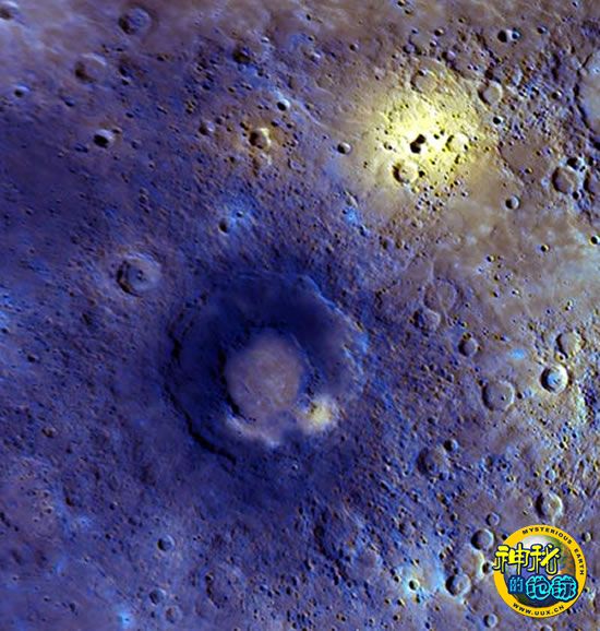 这张全彩图(enhanced-color)显示的是水星表面的一个区域,“信使”号在第三次飞越时,获得这个地区的详细信息。从图上可知,这里的火山活动显然非常剧烈。右上方附近的嫩黄色区域,是一个无边的低压区中心,这里可能是爆发的火山口所在地。图片中心的双环盆地的内部平坦,这可能是火山作用产生的结果。