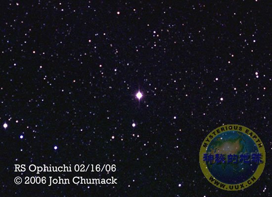 2006年2月,再发新星RS Ophiuchi (RS Oph)诞生了。每隔20年左右的时间,该双星体系的白矮星就会从其红色的巨型伴星那里积聚足够多的物质,促成一次热核爆炸,这种爆炸在我们看来是其亮度由非常暗的12.5等左右增加到5等。