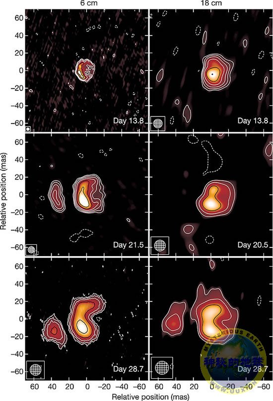 Sokoloski等人利用卫星X-射线观测结果来揭示最初阶段的情况,在最初阶段,爆炸波自由向外传播。在2天时间内,向外传播的波开始慢下来,说明爆炸所产生的碎片要比从这样一次事件所预期的数量少得多。O'Brien等人利用最大的陆基射电天文望远镜阵列来对RS Oph进行观测,因而能够在最初发现14天之后首次对一个新星爆炸中的冲击波进行直接成像观测。所显示的结构表明,该天体正在向一个恒星残体发展演化,类似于一种二类超新星的演化,但它是在几个月的时间尺度上演化的,而不是在千年的时间尺度上。