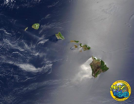 自1983年以来,基拉韦厄火山便一直处于不断喷发之中。夏威夷群岛余下部分从右至左年代逐渐变老,分别是毛伊岛、卡霍奥拉维岛、拉奈岛、莫洛凯岛、瓦胡岛、考艾岛和尼豪岛。文中这幅照片由宇航局陆地卫星的中解析度成像分光辐射度计(MODIS)拍摄。