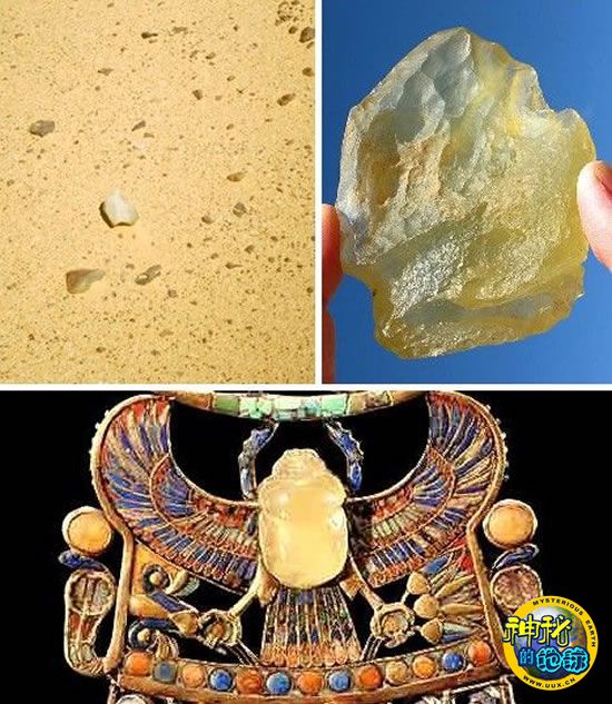 除去闪电的袭击,还有两个别的方法可以从砂土中提炼出玻璃。但是这两种方法都需要应用极度的高温和极其强大的力量加以辅助。第一种是陨星效应,比如说将近三千万年以前,发生在利比亚和埃及接壤处的那次陨星事件。整个区域都被融化的砂石所覆盖,当其冷却之后,整个沙漠呈现出一种黄绿色的如神灵般飘渺虚幻的色调。这种利比亚沙漠玻璃被古代的埃及人所称道,后来这种玻璃被用来制作为装饰物,镶嵌在了塔特王胸甲的正中位置。