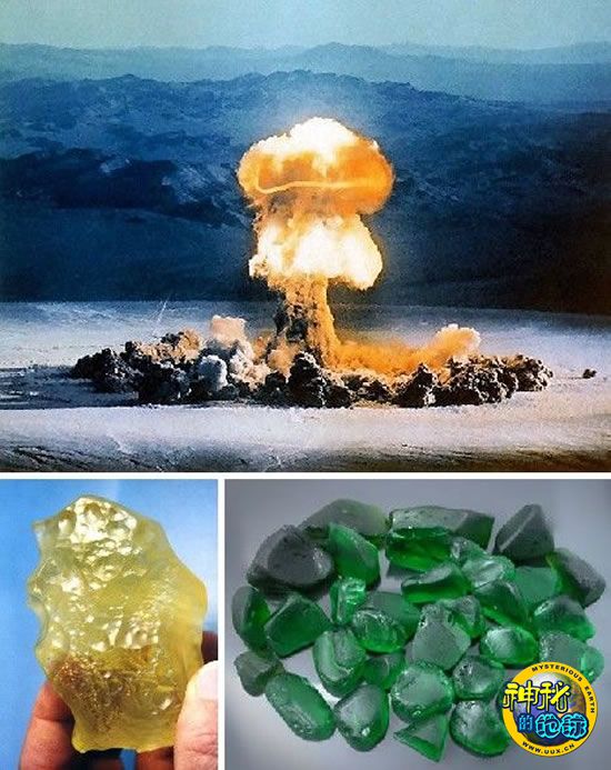 另外一种方法就是利用底面的或者是靠近地面水平线的原子爆炸能量制造玻璃。1945年6月16号,第一枚原子弹在新墨西哥靠近阿拉莫戈多的白沙试验基地爆炸。这颗被命名为“三一原子弹”释放了20,000吨的能量,并将爆心投影点组织周边的大片区域覆盖上了一层绿色的玻璃。因此,这种绿色的玻璃也被命名为“三一玻璃”,它一直乃至现在仍具有温和的放射性元素,也一直被收藏家和纪念品爱好者所觊觎。