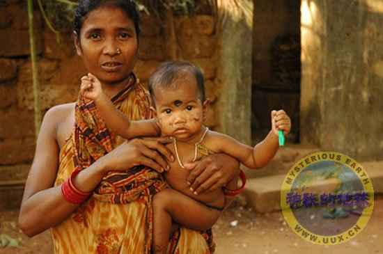 A forest tribal holds her baby in the Indian village of Krishnanagar, just outside Chandka Wildlife Sanctuary in the eastern state of Orissa, on October 26, 2007.