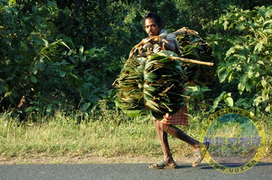 A forest tribal man carries saal leaves collected from inside Badrama Wildlife Sanctuary in Orissa, India, on October 25, 2007.