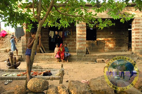 A relocated family sits outside their unfinished brick house in the village of Krishnanagar, just outside Chandka Wildlife Sanctuary in Orissa, India, on October 26, 2007.