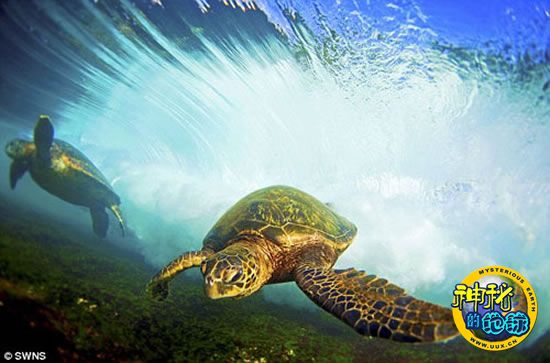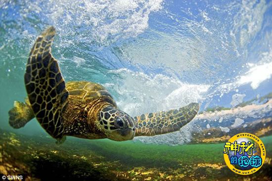 在夏威夷Laniakea海滩上,绿海龟几乎每天都做同样的事情,它们吃着海藻,享受休息时光。今年40岁的李特先生说,“海龟们喜欢穿过波浪,并在波浪下面游泳”。