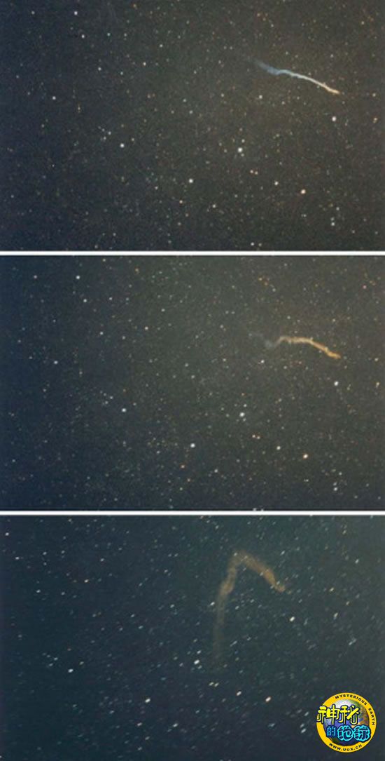 乔·拉奥1996年11月17日从美国宾夕法尼亚洲布洛汉德维尔市拍到的一个狮子座流星的后效应图像。他的Nikormatte 相机对准了仙后座的“W”。当一颗明亮的大流星划过天空时,他没来得及拍,但是,这颗流星的轨迹持续了5分钟之多。第一张照片是流星出现后15秒左右拍摄的。第二张照片是流星出现后约1分钟拍摄的,最后一张是流星出现后5分钟拍摄的。高层大气的风让流星轨迹发生扭曲。