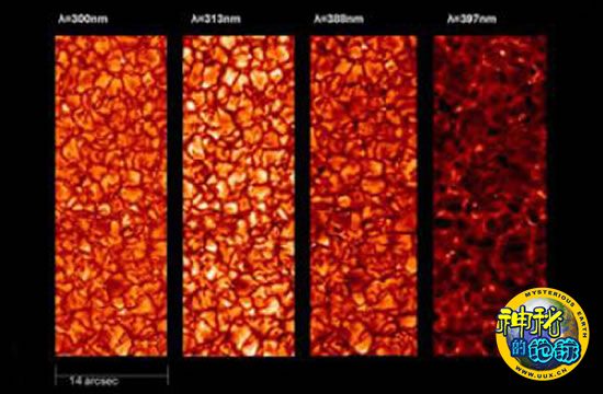 “日出”望远镜拍摄的图片,显示了近紫外线中4种不同波长范围里所谓的颗粒状结构。这种光结构是太阳磁场的基本元素。
