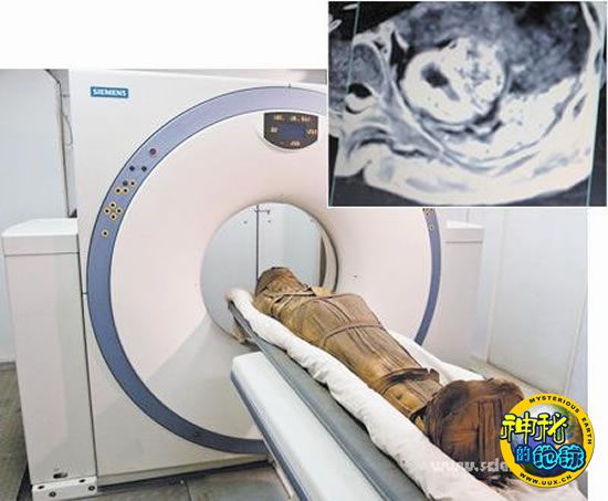 一具即将进行CT扫描的古埃及木乃伊,小图显示的是木乃伊的心脏具有钙沉积物——这正是心脏病的信号。