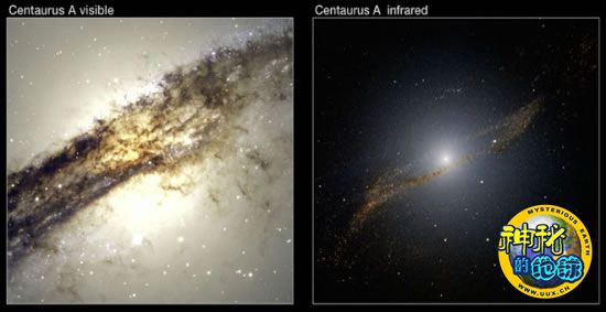 左图显示的是半人马座A星系可见光图片,右图是半人马座A红外图片。右图可见一个被半人马座A吞食的星系所留下的四边形“残骸”。