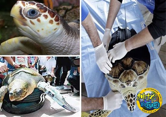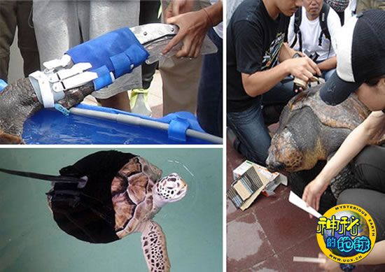 大西洋绿海龟阿利森(Alison)只有一个鳍,虽然它能游泳,但总是在原地兜圈儿。不过给它安上假肢后,这只可怜的海龟就能沿直线游动了。科学家为它设计了一个特殊的黑色橡胶外套,并用碳纤维把它安装在阿利森身上,让它能随其他海龟一起缓慢前行。