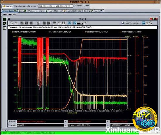 这张欧洲核子研究中心11月30日发布的照片显示了质子对撞的数据图。欧洲核子研究中心30日宣布,该中心当天早间将大型强子对撞机内的两束质子流加速到1.18万亿伏特的能级,创下了新的世界纪录。欧洲大型强子对撞机位于日内瓦附近瑞士和法国交界地区地下100米深处、总长约27公里的环形隧道内,它将为科研人员研究宇宙起源和各种基本粒子特性提供强有力的支持。