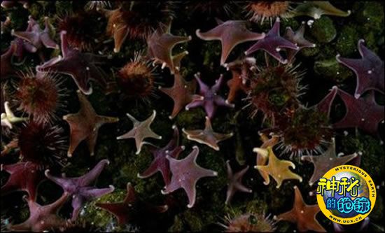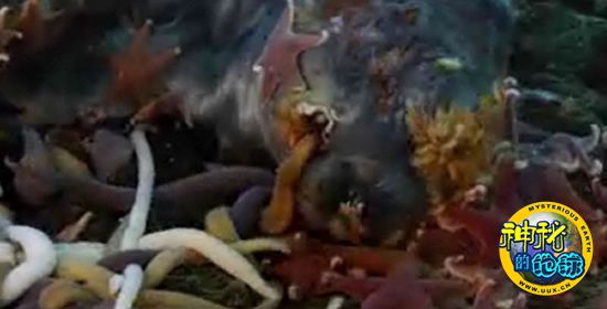英国一只摄影队在南极厚厚的冰层下拍摄到大量五颜六色的海星和3米长的巨型虫。他们通过延时拍摄发现,大量深海生物临时聚在一起,疯狂地争吃一只沉入海底的死海豹。