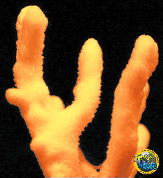 紫外线照射下的一块珊瑚发出了黄色的荧光