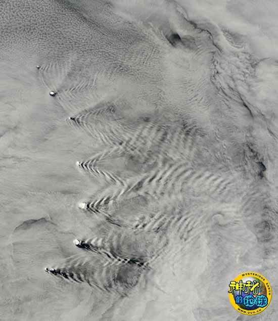 一周太空图片精选:黑洞高能喷射物点亮恒星 来源: 神秘的地球 时间:2009年12月02日 14:25 4.云现弧形洞 云现弧形洞(图片提供:Jeff Schmaltz, MODIS Land Rapid Response Team, NASA GSFC ) 在这张由美宇航局Terra卫星拍摄的最新照片中,英属南桑威奇群岛在大西洋上空的云雾中形成了V形“航迹”,看上去就像是在平静的海面上行进的舰艇一样。随着大风从每座小岛周围刮过,空气会形成波,气波温度在山峰下降,在海槽升高,使得云在山峰形成,在海槽则不会,从而产生了我们从图中看到的云中出现弧形洞的景象。 上一页12345下一页 上一篇 下一篇