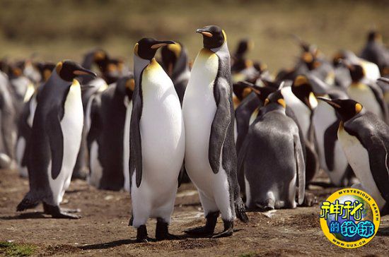 帝企鹅主要生活于南极洲以及附近海洋中。本图中的这群帝企鹅生活于南大西洋的福克兰群岛,它们正在繁育后代。帝企鹅通常在南极严寒的冬季繁殖后代,因为冬季敌害相对较少。奇特的是,雌企鹅只负责产蛋,雄企鹅才负责孵卵。孵卵期间,为了避寒和挡风,多只雄企鹅常常会并排而站,背朝来风面形成一堵挡风的墙。