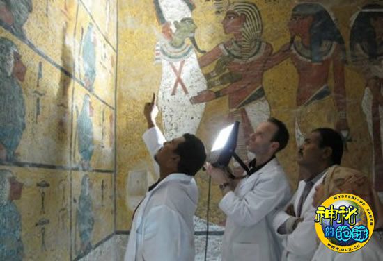 该科研组上个月首次到达埃及后,他们利用高科技产品X光机和照明设备分析墓穴墙壁上的漆层里的成分,只有查明油漆的确切成分,他们才能找出清理和保护壁画的最好方法。在闷热潮湿的环境下做这些非常费事。对一小块墙进行分析,就需要花费数小时时间。他们要做的第二部分工作包括,将游客对图坦卡蒙墓的影响减小。很多到过帝王谷的参观者好不容易挤到跟前,看个究竟,但感觉这个墓穴没给他们留下太深印象,因为墓里的大部分东西,例如所有黄金财宝,现在都保存在开罗的埃及博物馆里。