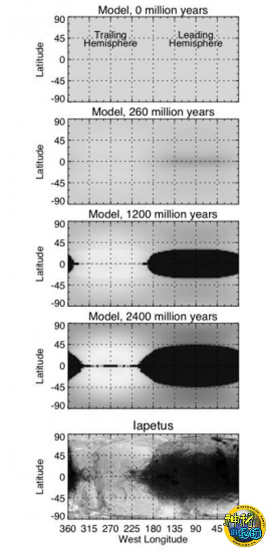 这一系列土卫八的图片显示了冰迁移电脑模型是如何解释这颗卫星的大部分全球外表特征的