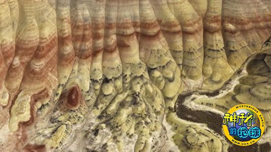 图中的“画山”位于美国俄勒冈州北部地区。在俄勒冈州“约翰时代化石床国家纪念地”公园里,一座座“画山”总共绵延1267公顷。山上的红色和金黄色岩石是由大风吹来的火山灰所形成,这些火山大概开始喷发于3000万前。火山的每一次喷发都造成了当地的湿地和森林被火山岩和火山灰所埋没,最终形成了如今我们所见到的景象。火山灰中的矿物质为当地山脉涂上了一层美丽的色彩,红色的线条显得特别流畅和细腻。图中的黑色部分则是曾经生长在这一区域的植被的残骸。如今,俄勒冈画山已成为当地著名的景点之一。
