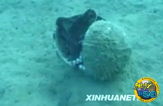 这张澳大利亚墨尔本的一个博物馆于12月15日公布的视频截图照片显示一只章鱼用触腕缠绕着一个椰子壳。科学家发现,这只聪明的章鱼在水中行动时可以把身子蜷缩在椰子壳里,用它作为自己的“保护伞”。