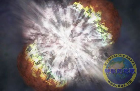 天文学家最近分析了被认为是迄今为止发现的最剧烈、也是最壮观的超新星爆发。他们表示,此次超新星爆发的壮观景象改变了他们对超大质量恒星“垂死挣扎”的一贯看法。这颗超新星代号为SN2006gy,位于2.4亿光年之外的英仙座NGC 1260星系。去年9月,这颗超新星忽然爆发,亮度达到太阳亮度的500亿倍,而其亮度也是一颗典型的超新星的100倍,打破了多项纪录,因此载入天文学史册。美国天文学家对这一壮观的天文事件进行了细致分析。他们在14日表示,SN2006gy超新星爆发可能是由一颗真正质量巨大的恒星爆炸形成的,这个庞然大物的质量起码是太阳质量的100倍。按照他们的推测,这颗恒星并非一次爆炸,而是分多次爆炸。领导此项研究的美国加州大学圣克鲁斯分校天文学家斯坦·沃斯雷说:“我们通常把超新星视作恒星的灭亡,但在这种情况下,同一颗恒星爆炸了多次。”研究结果刊登在最新一期《自然》杂志上。按照沃斯雷的推理,超新星是在一颗质量相当于太阳90至130倍的巨大恒星接近于生命终点时爆发的。恒星核心温度一旦达到难以想象的高度,这颗恒星的一些伽马射线会转化为电子和称为正电子的反物质。这种转变会造成辐射爆发强度忽然降低,恒星开始收缩。
