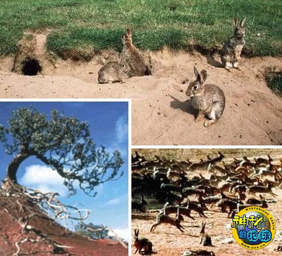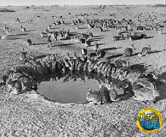 面对日益猖獗的野兔群体,澳大利亚人终于意识到问题的严重性。1937年,澳大利亚科学与工业研究委员会曾经尝试利用多发性粘液瘤病毒来对付野兔。政府专门在一些水池里投放病毒药水并引诱野兔前来喝水。图中右下角显示的就是一群野兔正在“政府药池”旁喝水。到1950年,这种病毒终被证明可以安全地用来对付野兔。两年后,澳大利亚的野兔数量由最高峰时的6亿只左右下降到“只有”1亿只左右。