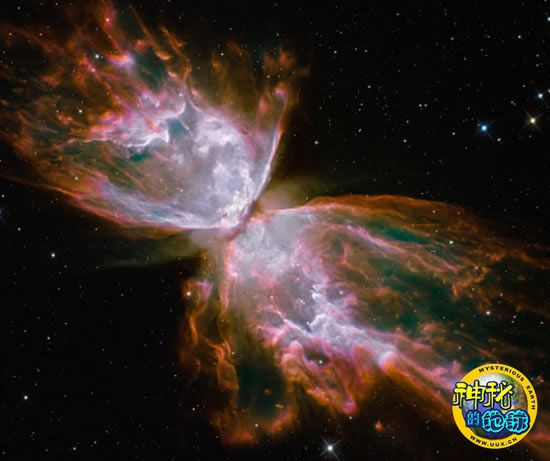 本图就是“哈勃”太空望远镜修复后所拍摄的首批深空照片之一。图中显示的是编号为“NGC 6302”的蝴蝶星云,它是一个行星状星云。“蝴蝶”的“翅膀”延伸的距离有2光年远,它是由高温气体组成,因此看起来光彩耀人。这些气体是由一颗距离地球所在的银河系约3800光年的垂死恒星所喷射出来的。气体以每小时60万英里(约合每小时96.6万公里)的速度被释放到太空当中,于是就形成了这一巨大、精致的“蝴蝶翅膀”结构。