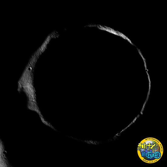 为了证实这一事件,月球侦察轨道器拍摄了月球两极详细的照片,本图就是其中之一。图中显示的是月球北极Erlanger陨坑。Erlanger陨坑直径大约为10公里,距离北极点仅仅90公里。这是太阳刚刚从地平线升起时的照片,只有陨坑凸起的边缘被阳光照亮,恰好形成一个看起来相当诡异的光圈。然而,陨坑内部仍然深不可测,永远见不到阳光。