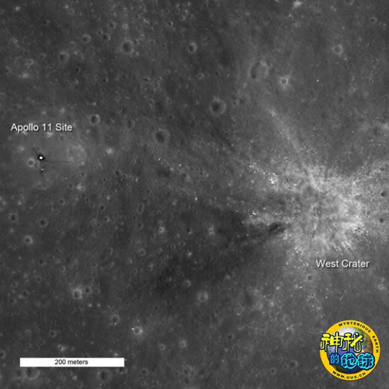 这张高分辨率照片是由月球侦察轨道器所拍摄。照片清晰地显示了“鹰”号登月舱着陆点的详细位置,着陆点距离“威斯特”陨坑仅仅数米远。在陨坑的左侧,零星地散落着一些碎石块,就是这些碎石当年差一点导致登月舱舱毁人亡。当时,登月舱燃料箱漏气,导致它飞向月球的速度过快,极有可能坠毁于这些碎石之上。幸运的是,阿姆斯特朗临危不乱,在登月舱燃料耗尽前30秒终于在碎石间及时找到一个安全着陆点,登月舱成功地降落于月球表面。