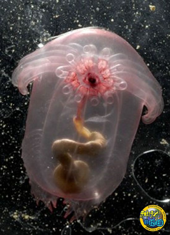 这是美国科学家今年在墨西哥湾北部海域深海下发现的透明海参。这种透明海参的运动器官极像大象的耳朵。在触角和运动鳍的帮助下,透明海参可以在深水海域里自由活动。为此,科学家为这种透明海参起名为“小飞象”。这种海参生活在1.7英里(约为2750米)深的海底。