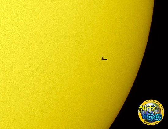 摄影师蒂埃里·莱格特利用一台拥有特殊太阳滤光器的望远镜,捕捉到“亚特兰蒂斯”号航天飞机5月从太阳前面飞过时的微小轮廓。这张照片显示了进入轨道的“亚特兰蒂斯”号,一天后它将靠近哈勃太空望远镜,以便宇航员能执行一系列太空行走,对哈勃望远镜上的先进设备进行维修和升级。
