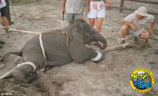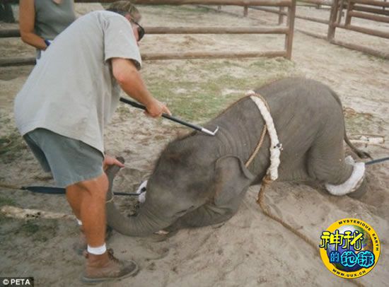 这些令人痛心的照片由昔日的一名驯兽员拍摄,揭示了马戏团训练小象的残忍一面。照片中,可怜的小象被绳索硬拖到地上,顶在后颈的一把钩子让它们不敢妄动。如果这些小家伙不合作,站在一旁的驯兽员便会用锋利的铁钩好好“调教”它。善待动物组织表示,小象还被迫与母亲分开,经受母子分别的痛苦。