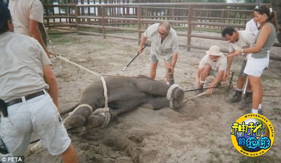 一群驯兽员用绳索捆住小象的手脚,彰显“团队合作精神”。