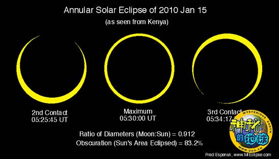 环食,是全年最重要的天象之一。1月15日的日环食全程将持续约5个小时,环食带平均宽达300千米,从非洲中部开始,终印度洋、印度南部、缅甸等国家最后进入我国。从两册更大地区可以欣赏到食分不同的日偏食。其中环食阶段持续最长时间的地区位于印度洋内,月球与日面边缘的两次内切间隔11分8秒。这个当然要比日全食理论上的最长见食时间长许多,即使在日环食里也算较长的了。