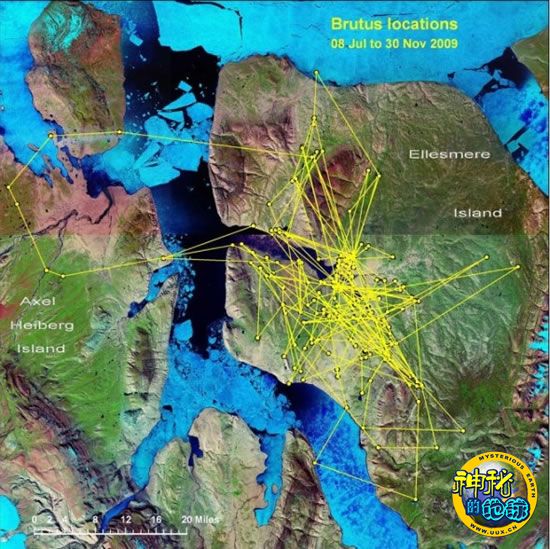 据卫星跟踪项圈发回的数据显示,在北极黑暗的冬天里,布鲁图斯所在的狼群仍在气温低达零下70摄氏度的环境中,为生计而四处奔波着。近段时间,它们在北极地区共转战了许多地方,行程长达数百英里(每百英里约合161公里)。