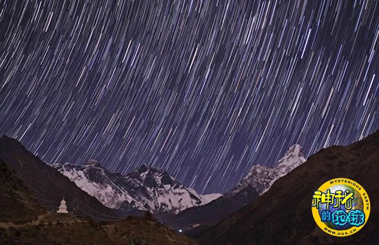 耀眼的光芒:一个扩展曝光拍摄拍出了尼泊尔夜空中移动的星星,好像在下流星雨,这里是尼泊尔通往喜马拉雅山的必经之路。