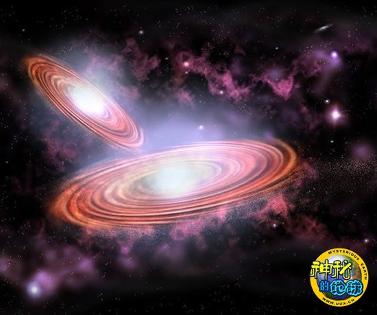 科学家认为大多数星系,包括我们所处的银河系,都会面临星系碰撞的现象发生。大多数星系,包括我们所处的银河系,其中心都有超大质量黑洞存在。当星系发生碰撞后,每个星系中心的这些超大质量黑洞将呈现出螺旋状,朝向新形成的星系中心,而在两个星系的碰撞过程中就会出现双黑洞系统。