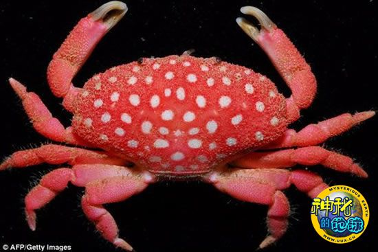 这种不同寻常的螃蟹发现于台湾南海岸,它的背部呈红色,并且相间着有白色小点。台湾国立海洋大学的霍和平教授说:“这种奇特的螃蟹学名叫做‘Neoliomera Pubescens’,通常它们主要生活在夏威夷岛海域、玻利尼西亚群岛和毛里求斯。”