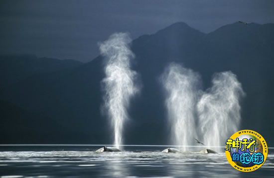 在东南阿拉斯加州特纳基湾,3只驼背鲸从呼吸孔里喷出气体和水柱