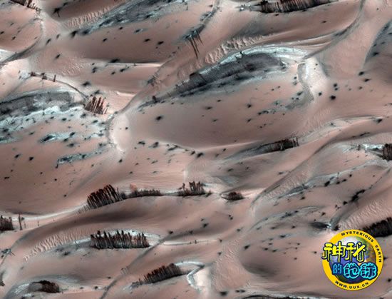 美国媒体近日公布了一张由美国宇航局火星勘测轨道器拍摄的高清火星照片,显示了火星北极点附近一个沙丘地的神奇景观。
