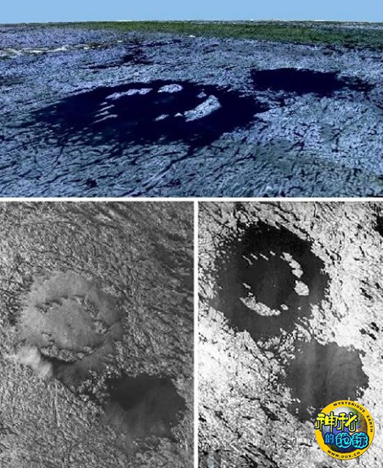这两个环形湖直径分别为26公里和36公里。其中,一个湖泊中还有一个内环群岛。这一地形表明,该湖泊最初的形状为多环形结构。这种双陨坑现象在地球上非常罕见,它通常发现于太阳系其他岩质行星或卫星表面。形成这种现象的原因可能是最初的撞击陨石在穿越大气层时一分为二。也有科学家提出一种假设,那就是一颗小行星身边伴有一颗小卫星。