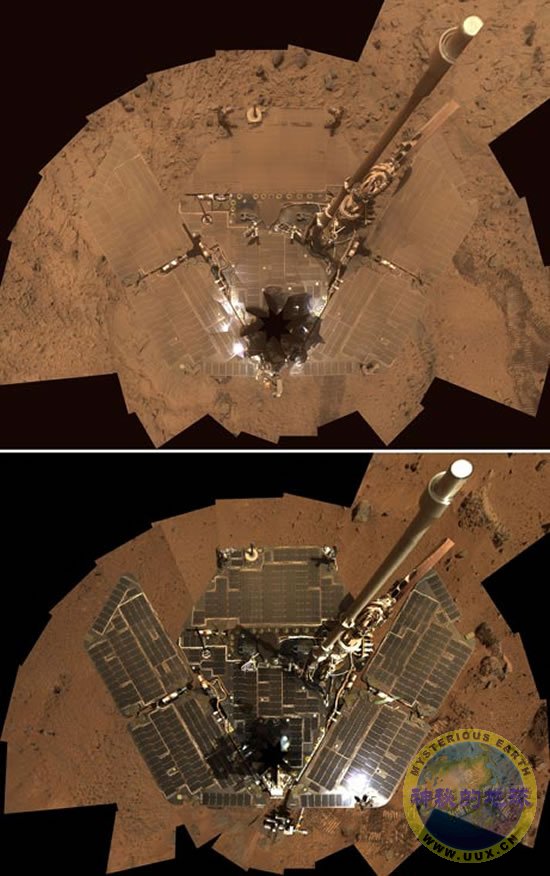 Recent storms covered the Mars rover Spirit with such a thick layer of dust (top) that it nearly blended into the Martian soil in this "self-portrait" compiled from images taken between October 26 and 29, 2007. By comparison, the rover was still shining bright (bottom) after two years on the red planet in an August 27, 2005, composite image.