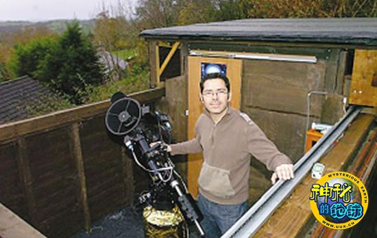 虽然彼得现在从事的工作和天文学风马牛不相及,但他仍然没有放弃对天文学的爱好,为了实现成为“业余天文学家”的梦想,几年前,彼得竟花费两万英镑自购天文器材,然后将自家后花园中的一间木棚改造成了一个“简易天文台”。彼得为自家的后花园木棚打造了一个可滑动屋顶,每当夜空群星灿烂时,彼得就会移开这个滑动屋顶,然后将一个20厘米口径的天文望远镜对准夜空,观测宇宙群星。彼得的天文望远镜上装有一部高清晰数码相机,它和他家中的电脑连在一起,可以将拍下的天文照片随时储存到他的电脑中。
