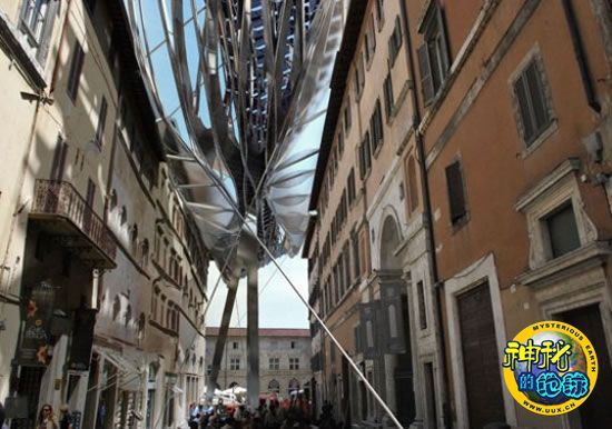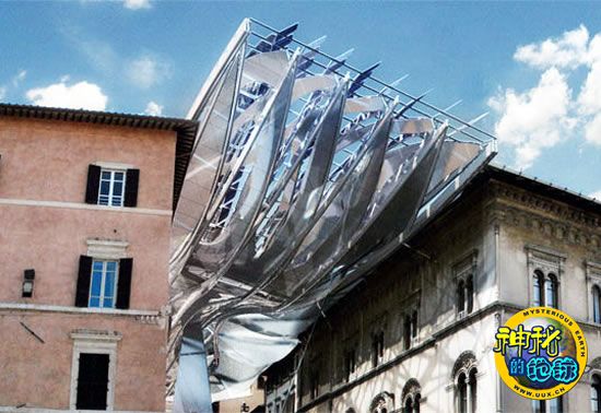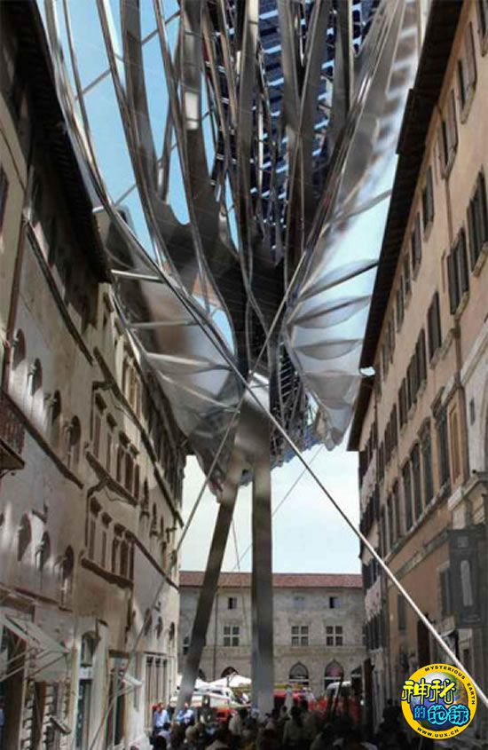 目前,这种新型“能源屋顶”已安装于意大利佩鲁贾市一个历史悠久的老城区内。乍一看,整个“能源屋顶”好像一个机器人怪物正在吞噬着这个可爱的意大利城市的老城区。事实上,它是作为一个考古遗址地下展厅入口的顶棚,而这个考古遗址地下展厅展出的都是佩鲁贾市周边重要历史文化遗址的考古成果,代表了佩鲁贾市的历史。