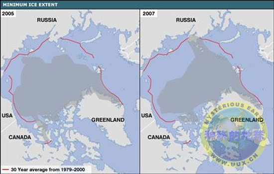 最低的海冰覆盖面积是在2007年9月出现的,并打破了2005年创下的海冰萎缩纪录,当时的覆盖面积为532万平方公里。根据1979年至2000年收集的数据,长期内的平均最低覆盖面积为674万平方公里。相比之下,2007年的覆盖面积锐减了261万平方公里,这一面积大约相当于阿拉斯加和德克萨斯面积的总和或10个英国的领土面积。