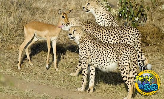 接下来发生了不可思议的事情,三只非洲猎豹和这只小羚羊玩耍起来,就像家猫玩毛线球一样。他说:“它们把小羚羊撞倒,但然后它们又失去兴趣,它们舔小羚羊或者把爪子放在它的头上,就这样过了大约15分钟。”更有趣的是,这个故事在惊险时刻过后还有一个圆满的结尾,一只非洲猎豹似乎要咬小羚羊的脖子时,这只小家伙突然跑开了。